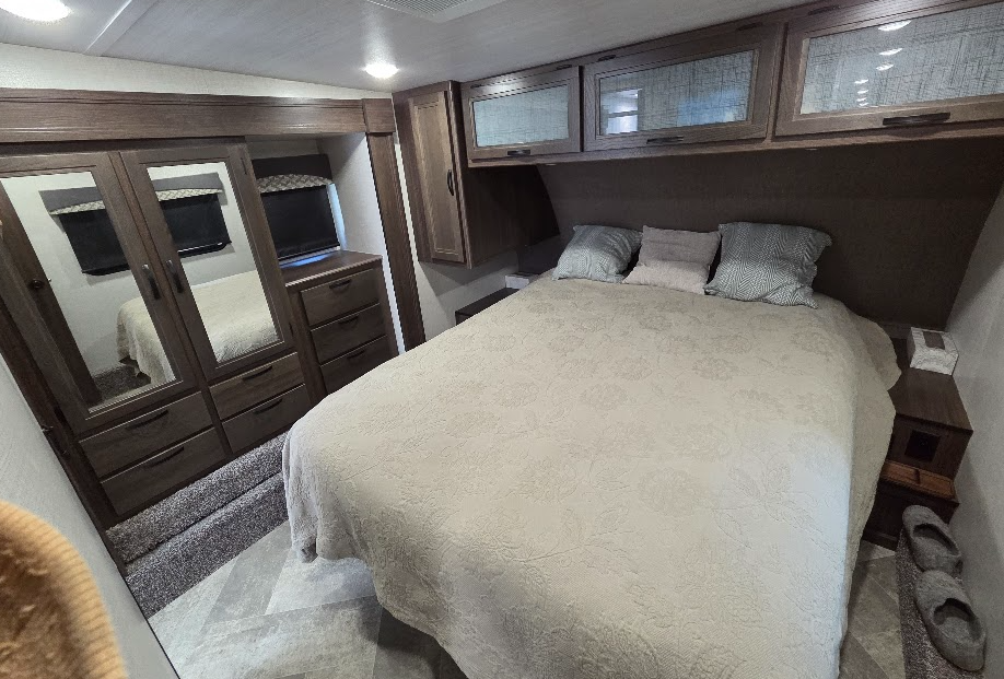 This immaculate fifth wheel features four expansive slide-outs, including dual slides in the living area for an open, inviting feel. The kitchen offers generous counter space and abundant storageβ€”perfect for cooking on the road. Enjoy a roomy master bedroom with ample closet space, providing a true home-away-from-home experience. Ideal for extended stays or full-time living!